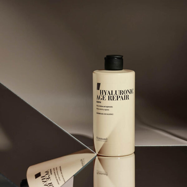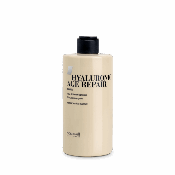 Hyaluronic Age Repair de Kosswell Professional es un champú de tratamiento antiedad desarrollado para combatir los signos del envejecimiento capilar. Su fórmula con ácido hialurónico de bajo peso molecular proporciona una hidratación intensa y duradera, mejorando la elasticidad, suavidad y densidad del cabello.