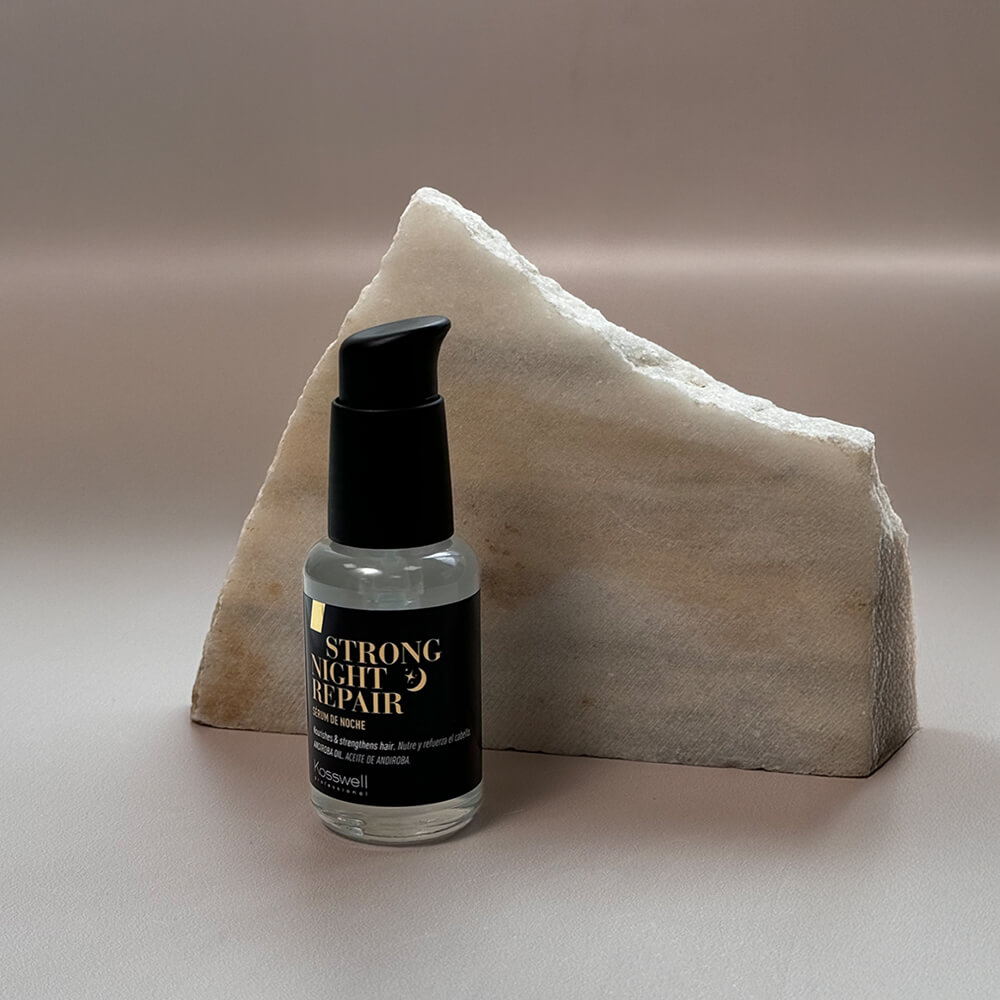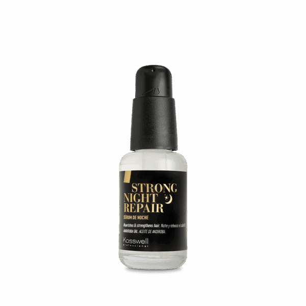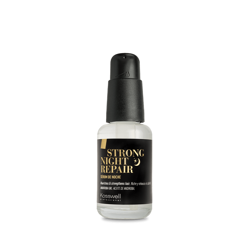 Strong Night Repair de Kosswell Professional es un sérum capilar de uso nocturno que actúa de forma intensiva mientras descansas. Su fórmula avanzada con células madre vegetales, keratrix™ y ácido hialurónico está diseñada para reparar el daño, fortalecer la fibra capilar y devolver elasticidad al cabello.