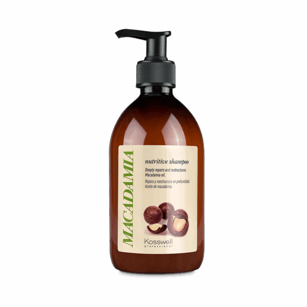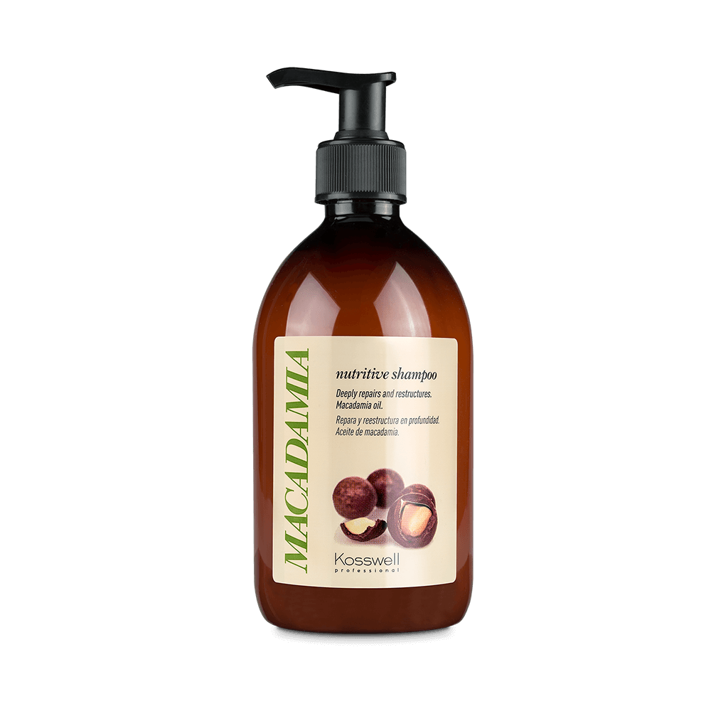 Macadamia Nutritive Shampoo de Kosswell Professional es un champú de tratamiento formulado con aceite de macadamia, reconocido por su alto contenido en ácidos grasos y propiedades antioxidantes. Este ingrediente nutre e hidrata en profundidad la fibra capilar, devolviendo elasticidad, suavidad y brillo natural al cabello.